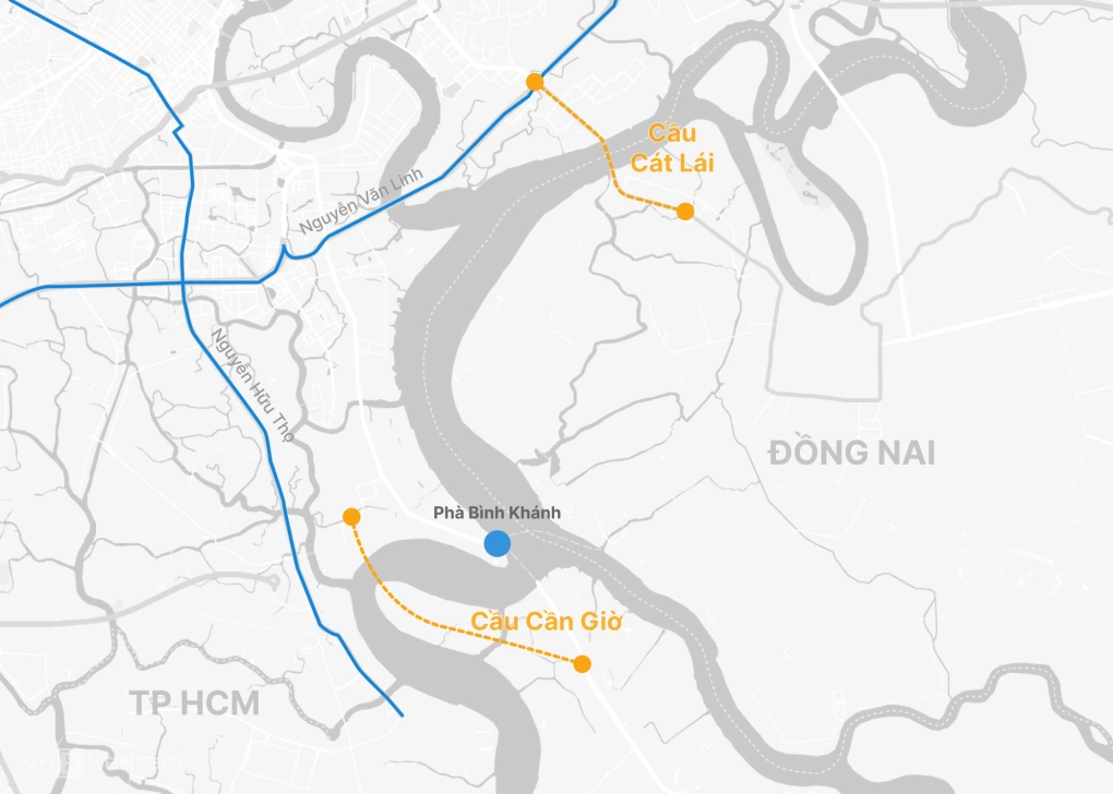 Ở phía đông, kế hoạch xây cầu Cát Lái từ lâu được xem là lời giải cho tình trạng quá tải tại bến phà nối TP HCM với Nhơn Trạch (Đồng Nai). Mỗi ngày, hàng chục nghìn lượt xe phải chờ phà hoặc chạy vòng theo quốc lộ 51 và cao tốc Long Thành - Dầu Giây.